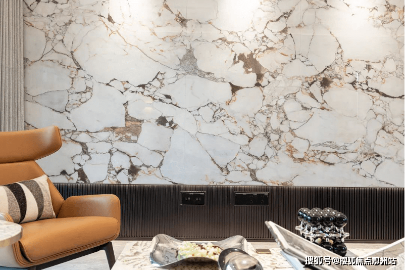 全石材通铺地面,配合金属踢脚线,定制的石材背景墙,墙顶一体化线条设计,大气而精致。