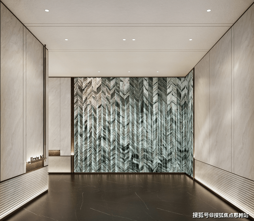 造型铝板吊顶+灯光膜+地面局部石材+专属楼栋指示,每天归家途中,氛围感拉满。
