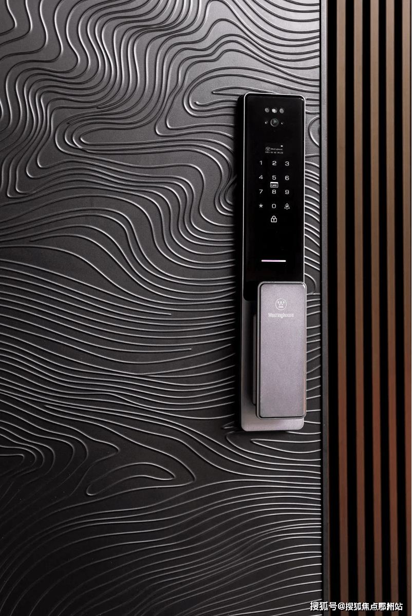 ,水波纹饰面门板,厚度和重量要比普通防盗门厚重很多,搭配智能五合一门锁。
